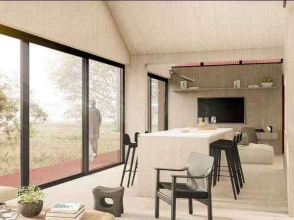 Equipamiento comunitario. Lechería (casa club con living, cowork, bar, comedor, quincho y fogón). Establo (galpón multiuso).